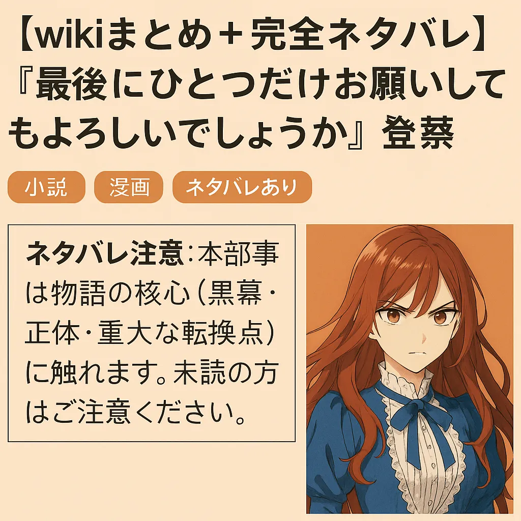 『最後にひとつだけお願いしてもよろしいでしょうか』は、鳳ナナさんによるライトノベル作品です。アルファポリスの女性向けレーベル「Regina Books」より刊行され、漫画版はほおのきソラさんが作画を担当しています。