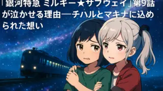 銀河特急 ミルキー☆サブウェイ 『銀河特急 ミルキー☆サブウェイ』第9話が泣かせる理由――チハルとマキナに込められた想い 2025年の夏に姿を現したCGショートアニメ『銀河特急 ミルキー☆サブウェイ』。星々を縫うように走る列車「ミルキー☆サブウェイ」を舞台に、規則を少し踏み外した若者たちが、清掃という小さな奉仕を通して自分自身と向き合っていきます。静かな宇宙に... 2025.09.20 銀河特急 ミルキー☆サブウェイ